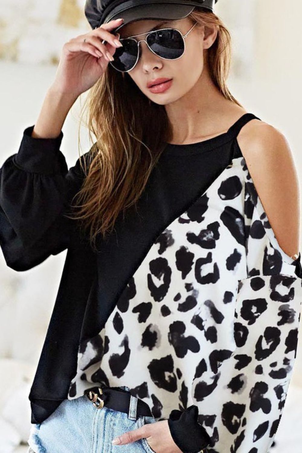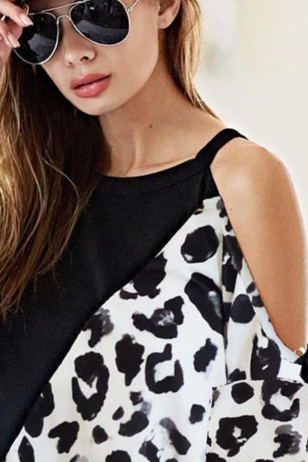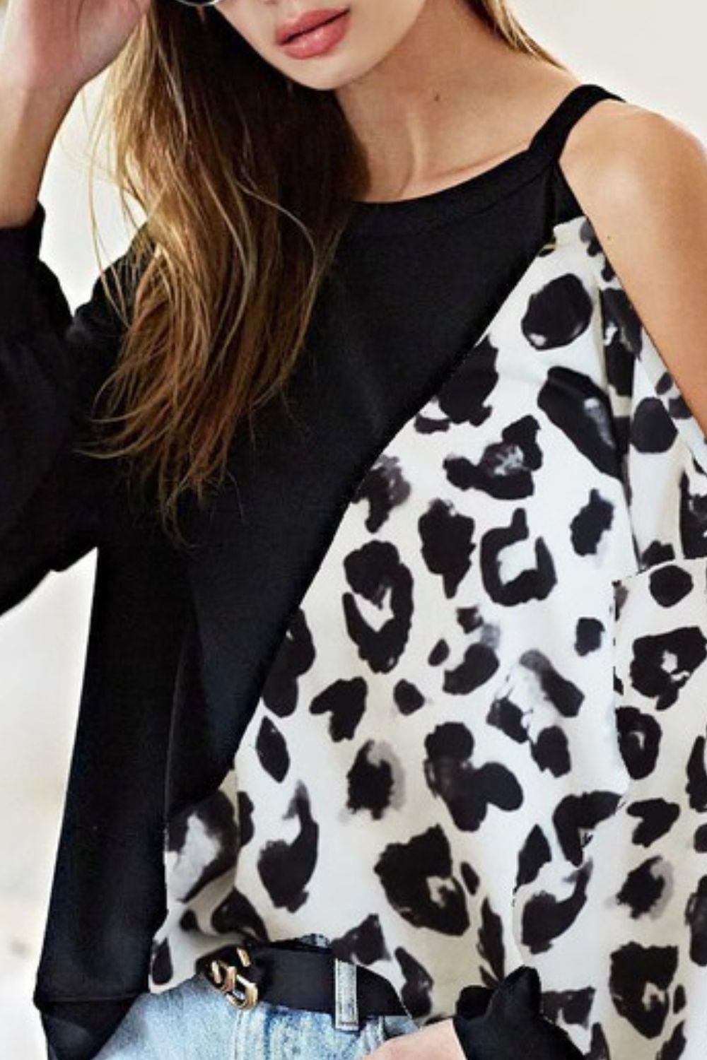 The French terry leopard cold shoulder top is a fashionable and comfortable top made of French terry fabric with a stylish leopard print design. It features cold shoulder cutouts for a trendy touch. Perfect for adding a touch of animal print to your outfit while staying cozy and chic.