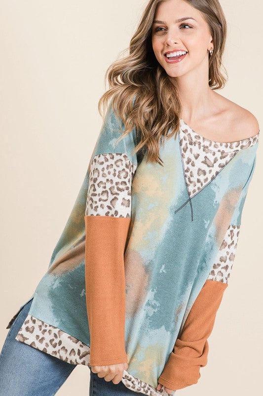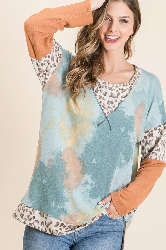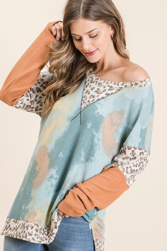 BiBi Tie-Dye Leopard Terry Round Neck Long Sleeve T-Shirt