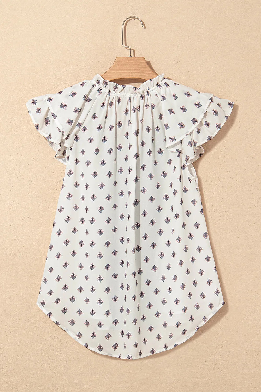 Boho Pattern Tiered Ruffled Sleeve V Neck Buttoned Blouse