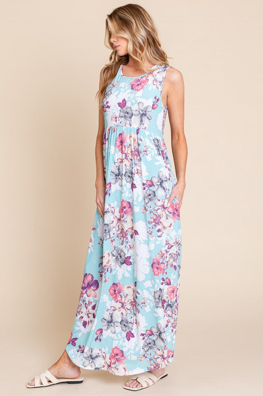 BOMBOM Floral Round Neck Sleeveless Maxi Dress with Pockets