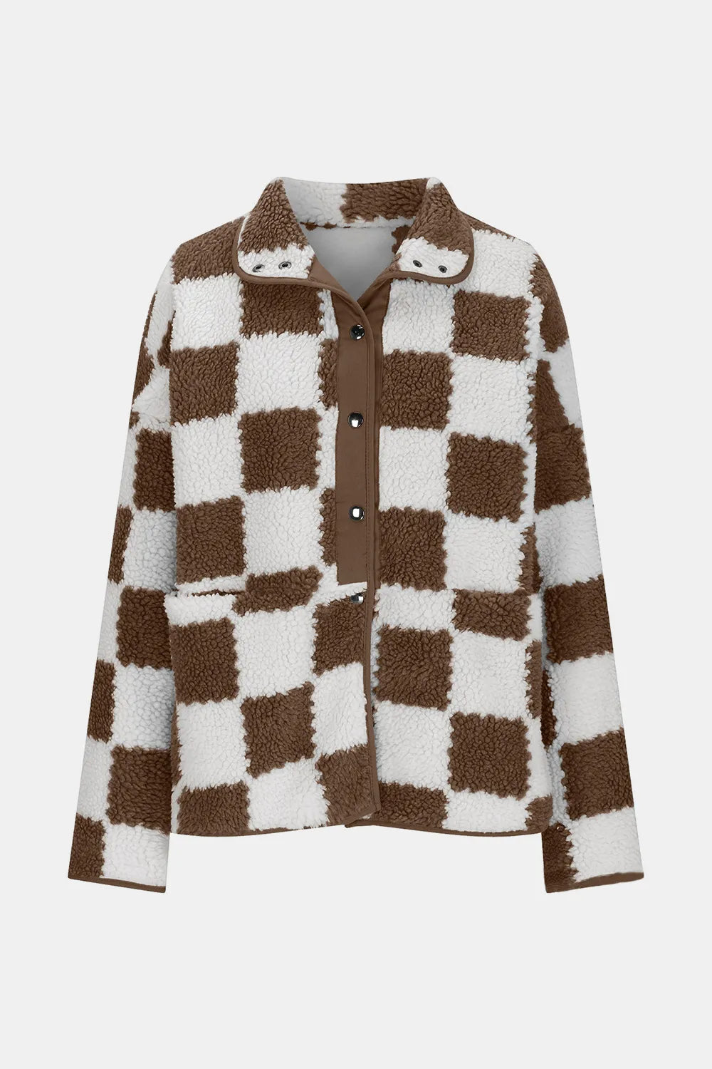 Checkered Snap Down Long Sleeve Teddy Jacket