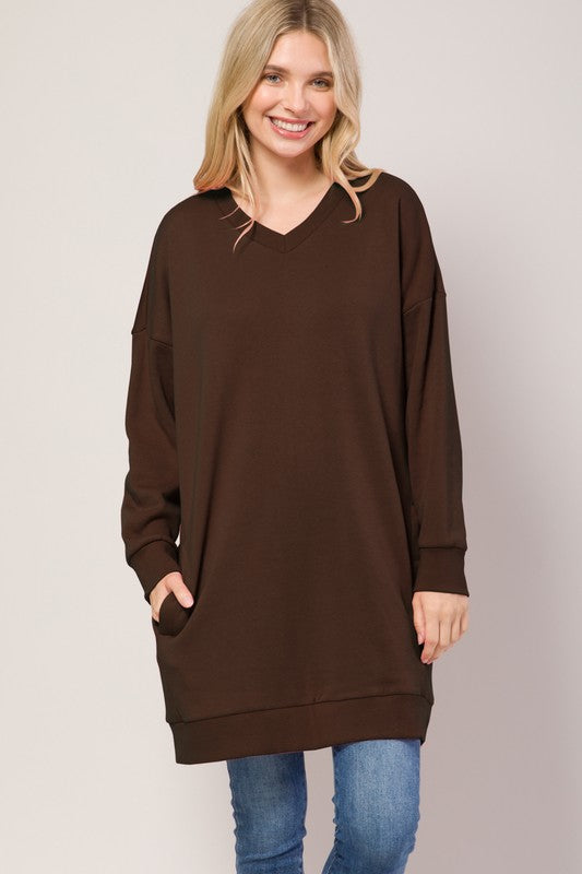 Features: Stretch Fleece Knit Material/ V Neck/ Tunic Length/ Functional Side Pockets.