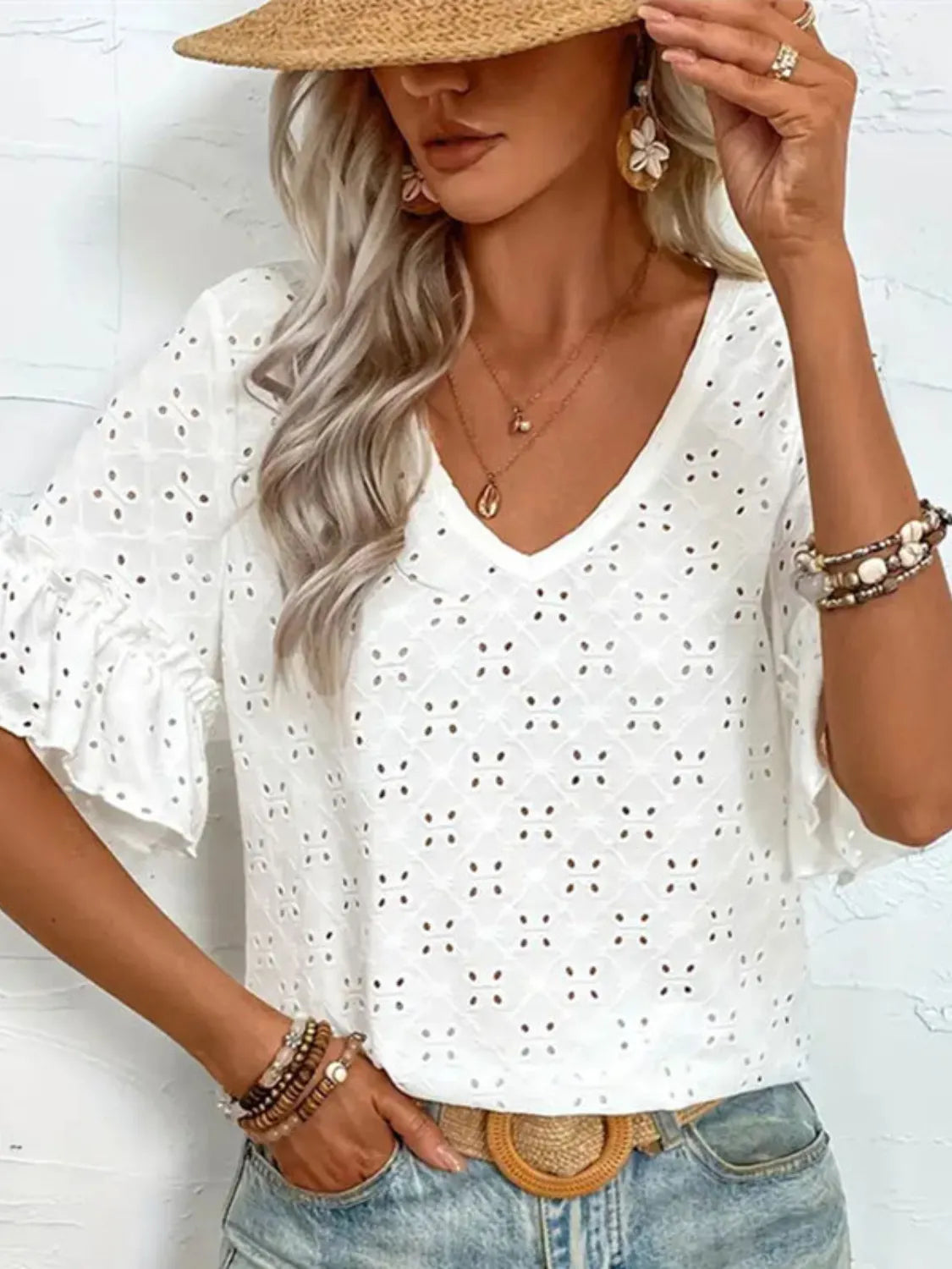 Eyelet V-Neck Half Sleeve Blouse