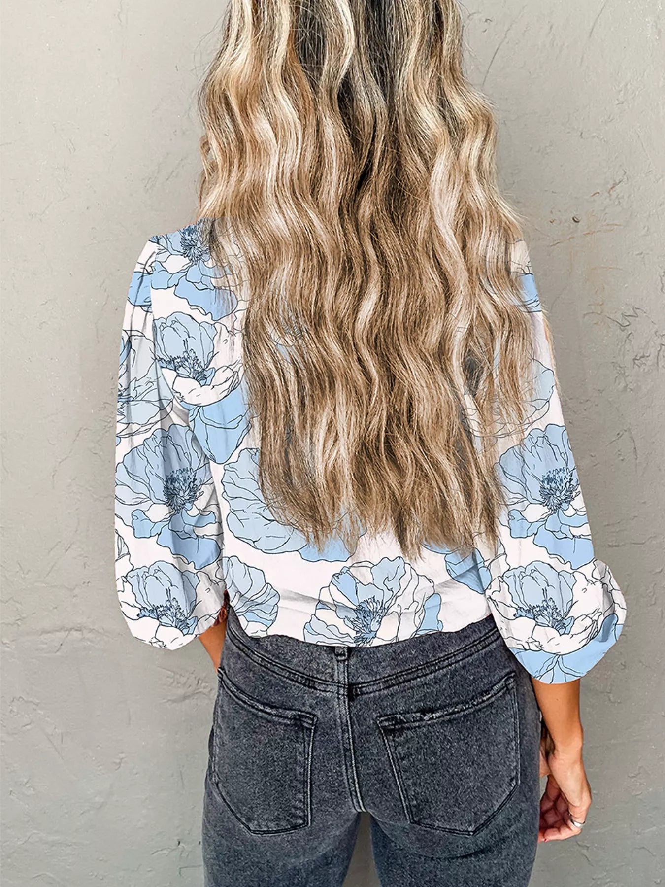Floral Print Frilly Smocked Square Neck Long Sleeve Blouse