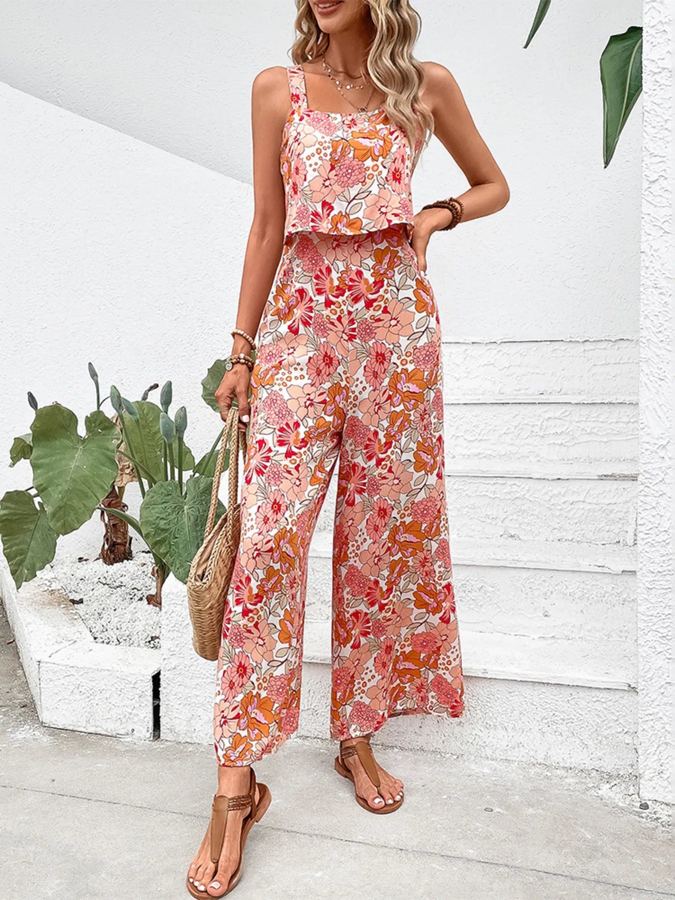 Floral Print Sleeveless Wide Leg Jumpsuit