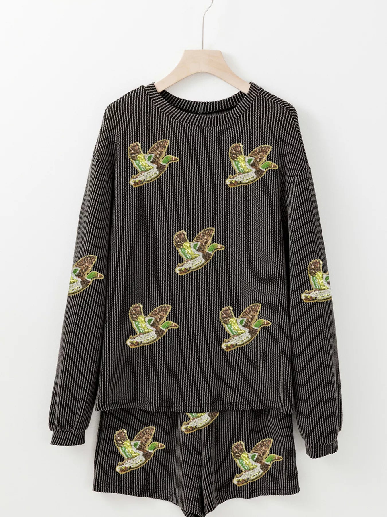 Flying Mallard Sequin Patched Ribbed Long Sleeve Top and Shorts Set