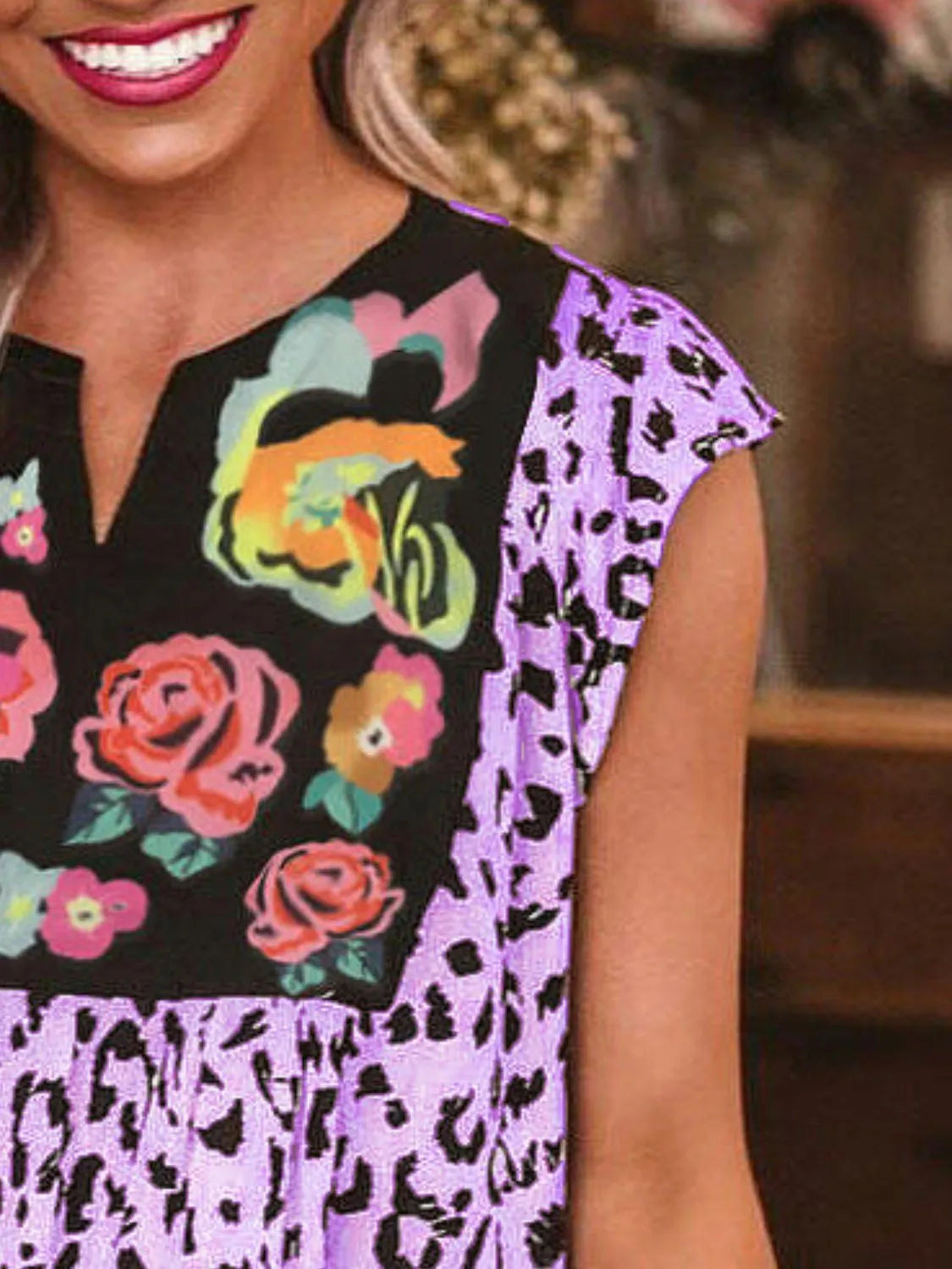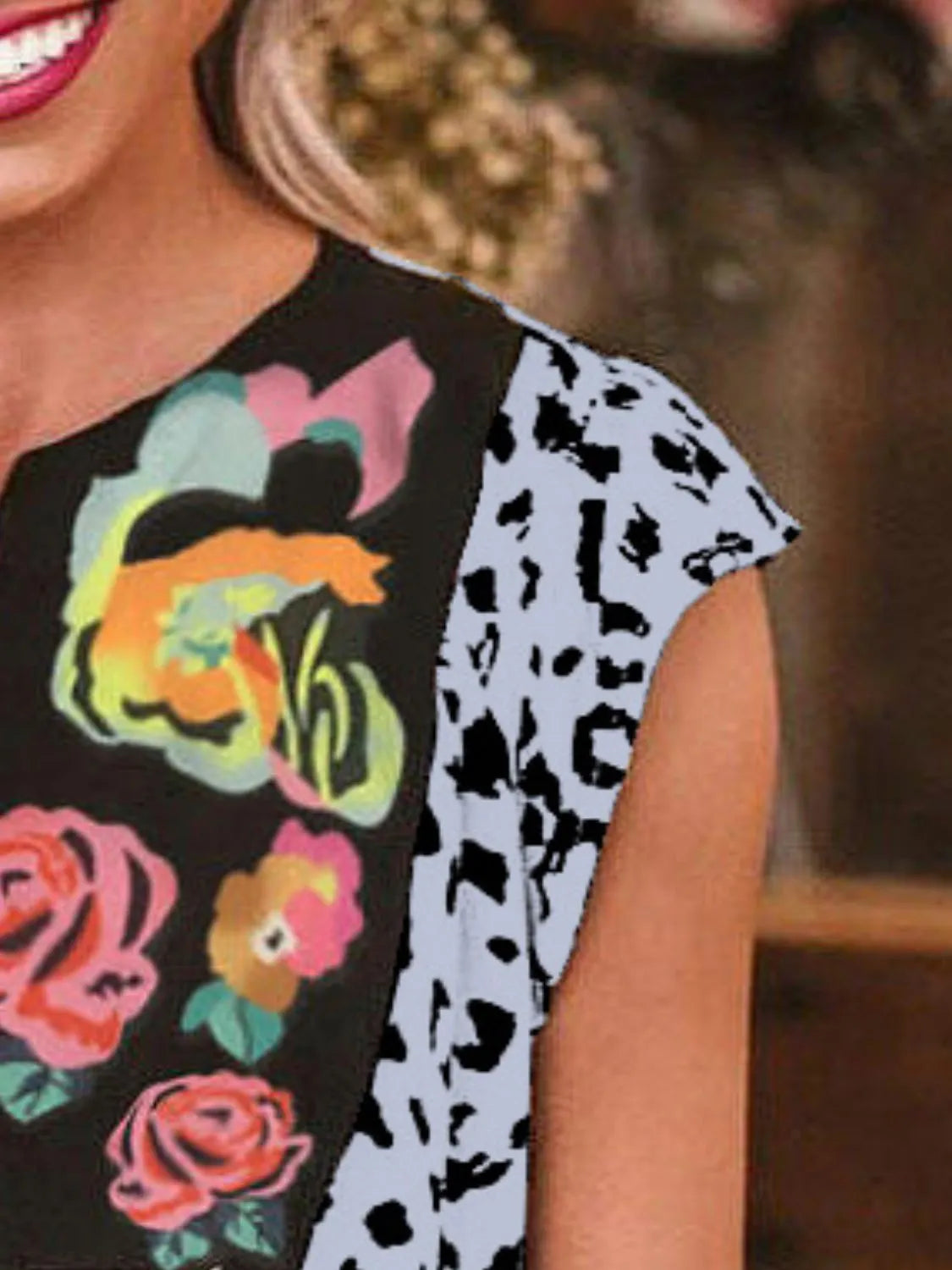 Full Size Leopard Floral Notched Cap Sleeve Blouse Plus Size