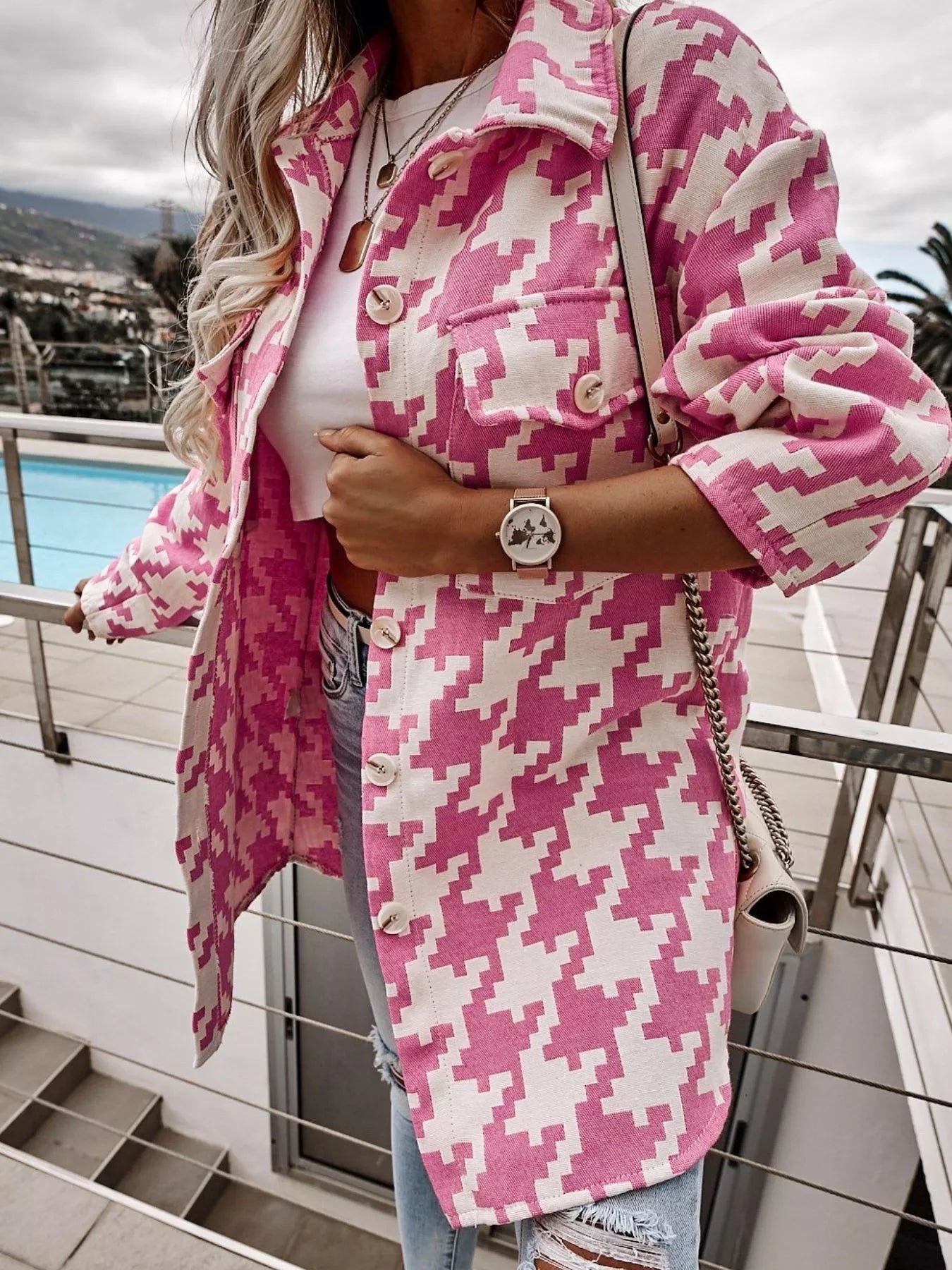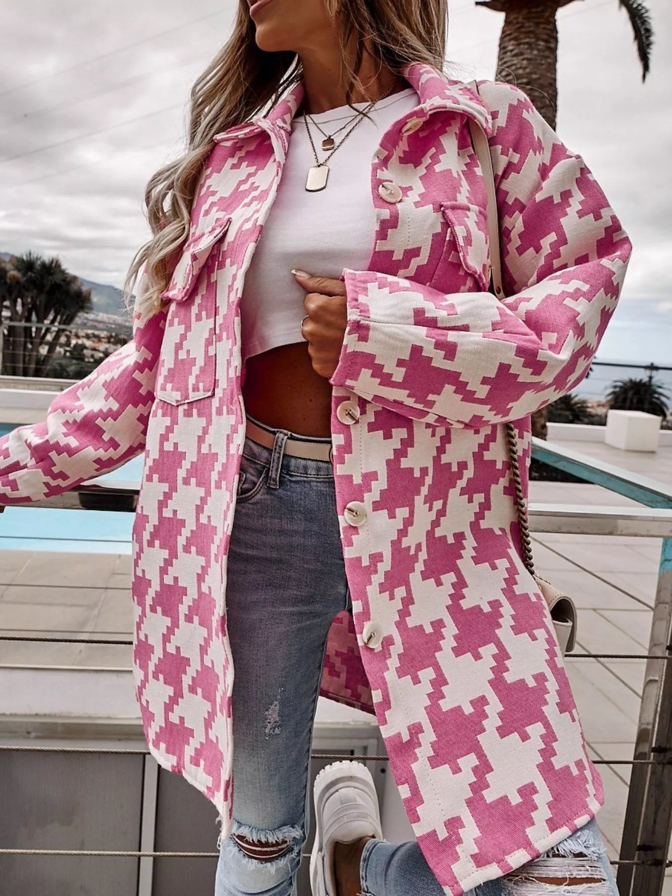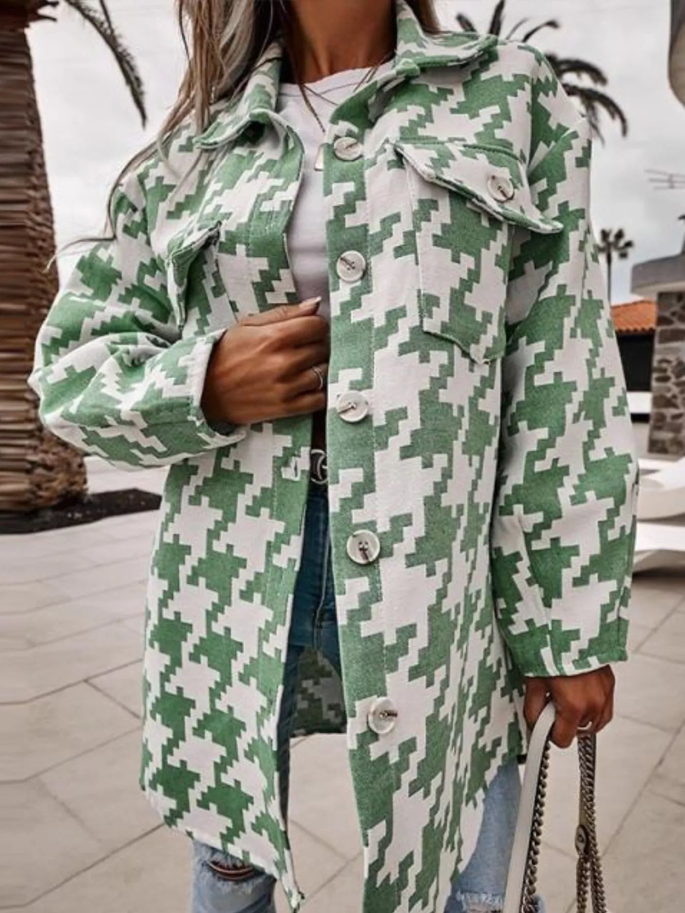 Houndstooth Button Up Long Sleeve Outerwear