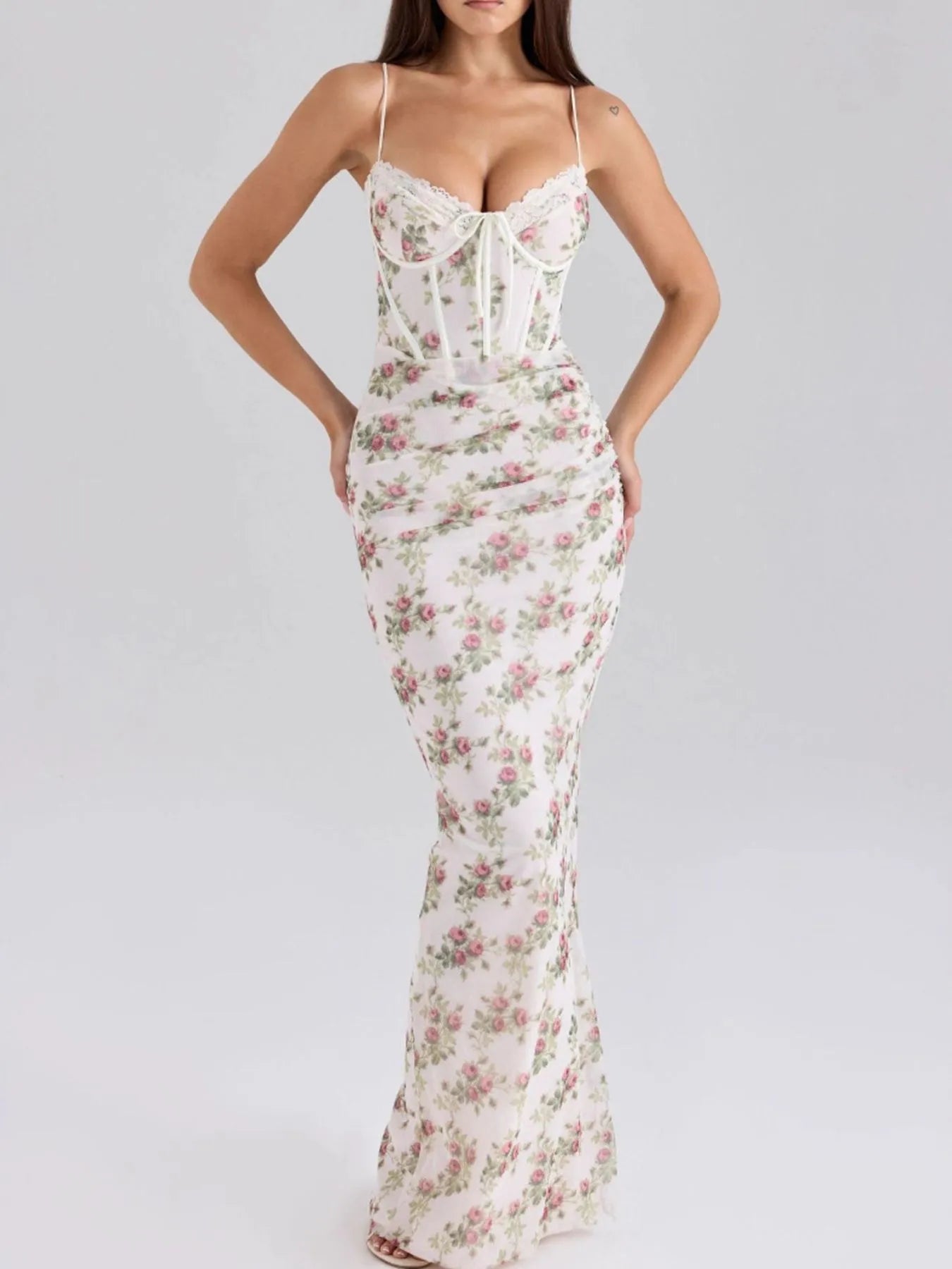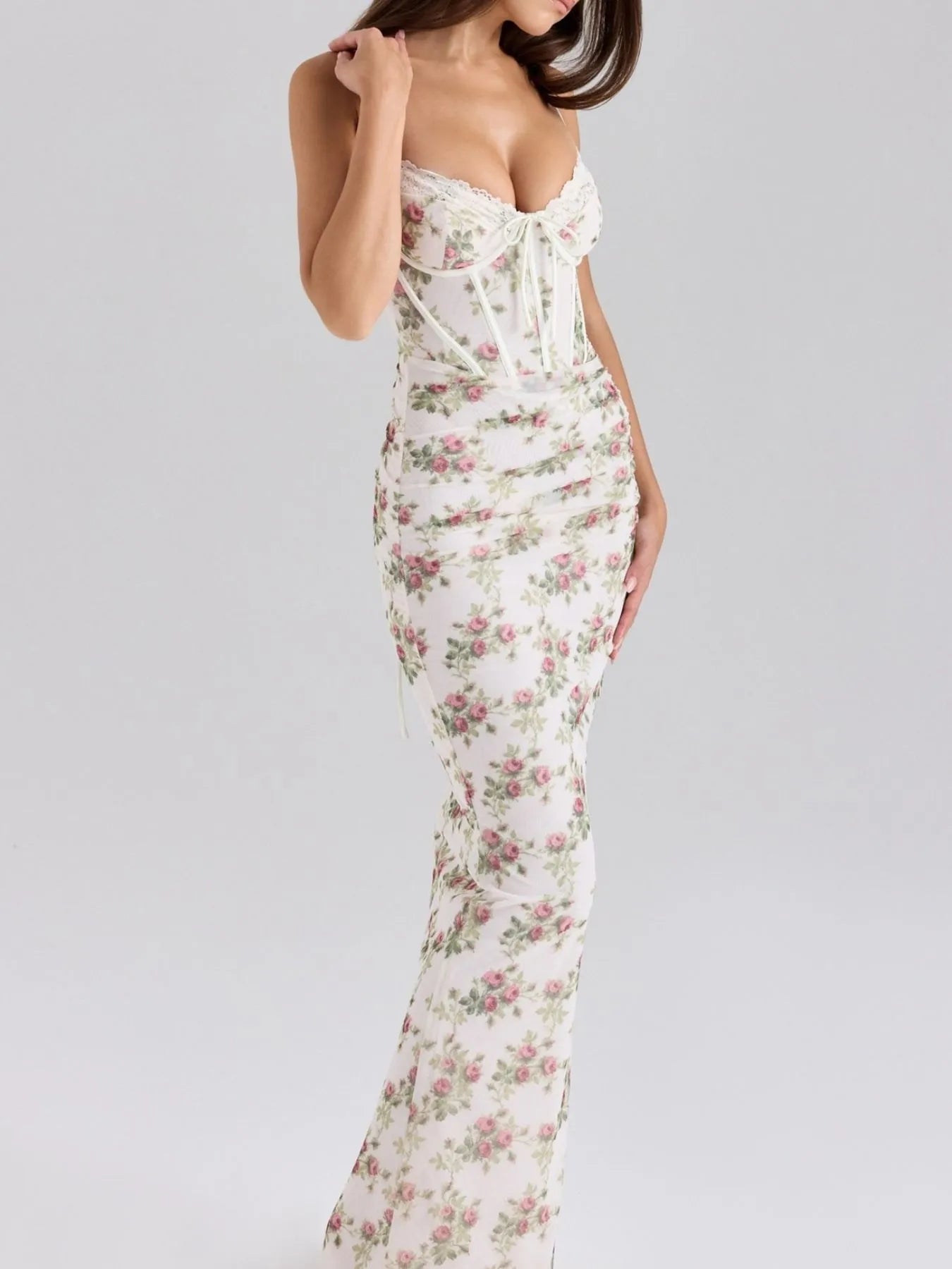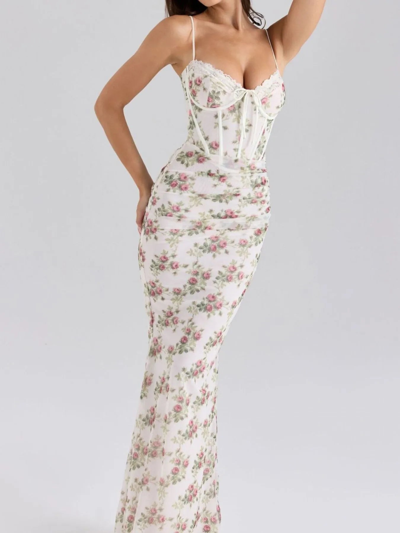 Lace Detail Sweetheart Neck Floral Print Maxi Dress