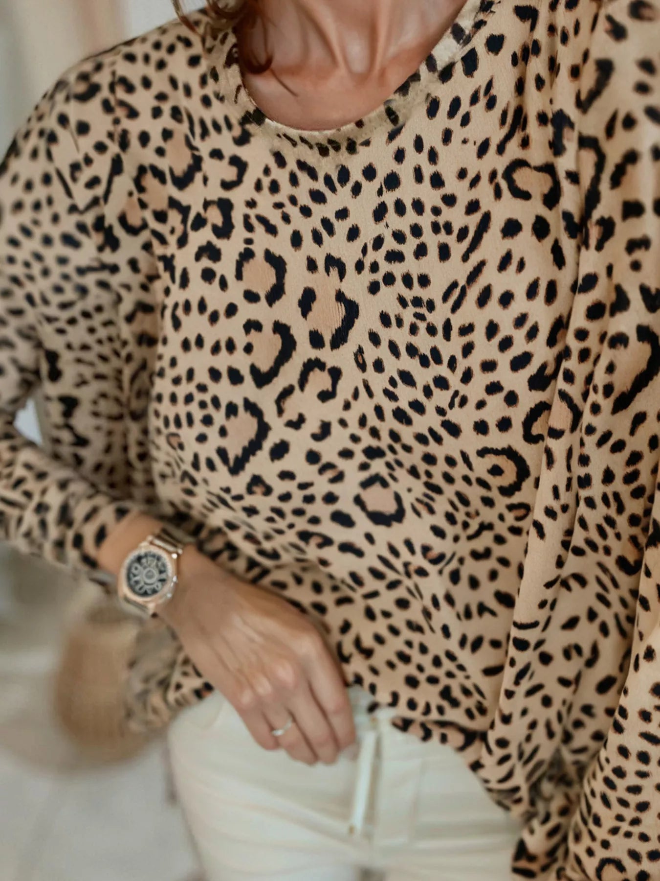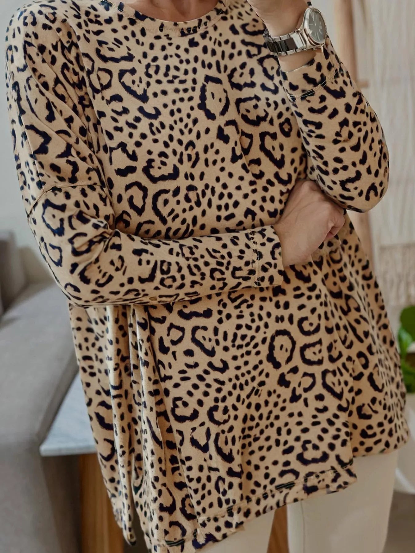 This stylish leopard print long sleeve t-shirt features a timeless animal print pattern in neutral tones of beige and black. Made from soft, comfortable fabric that drapes beautifully, this versatile top offers a relaxed fit perfect for everyday wear. The classic round neckline and long sleeves provide excellent coverage while maintaining a fashionable silhouette. Ideal for layering or wearing alone, this statement piece easily transitions from casual daywear to evening outings. The premium quality material ensures durability and comfort, while the machine-washable fabric makes maintenance effortless. Perfect for fashion-forward individuals who appreciate bold patterns and comfortable styling.