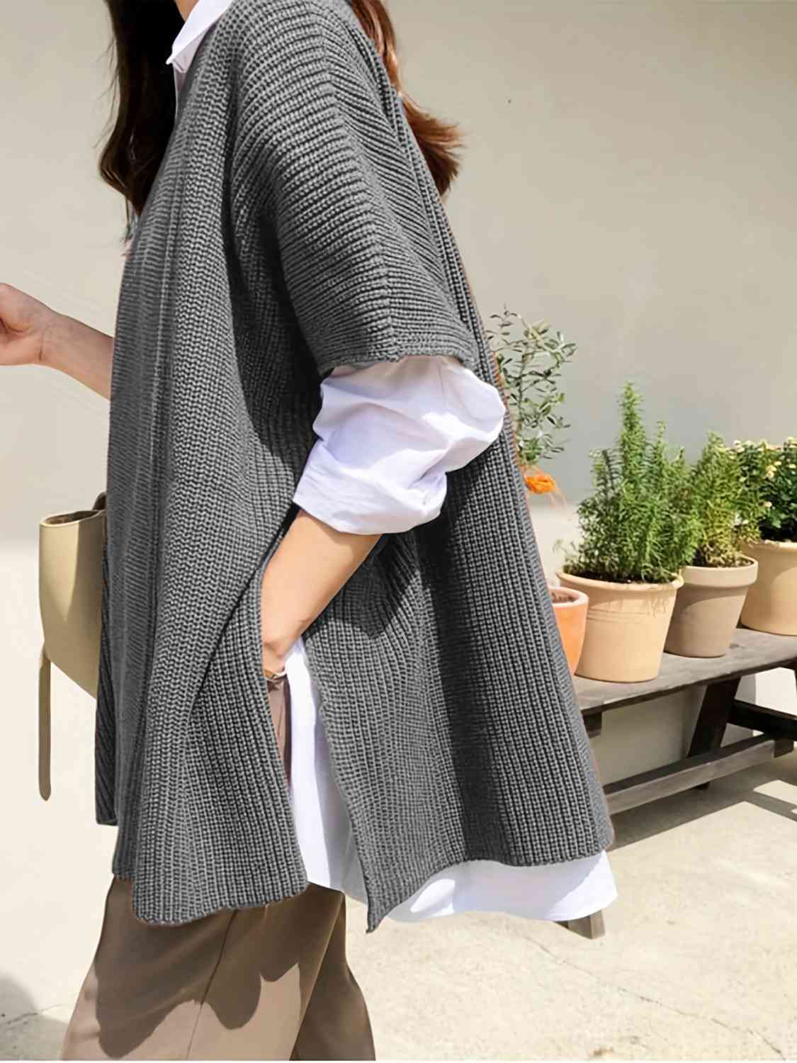 Plus Size Round Neck Slit Short Sleeve Sweater