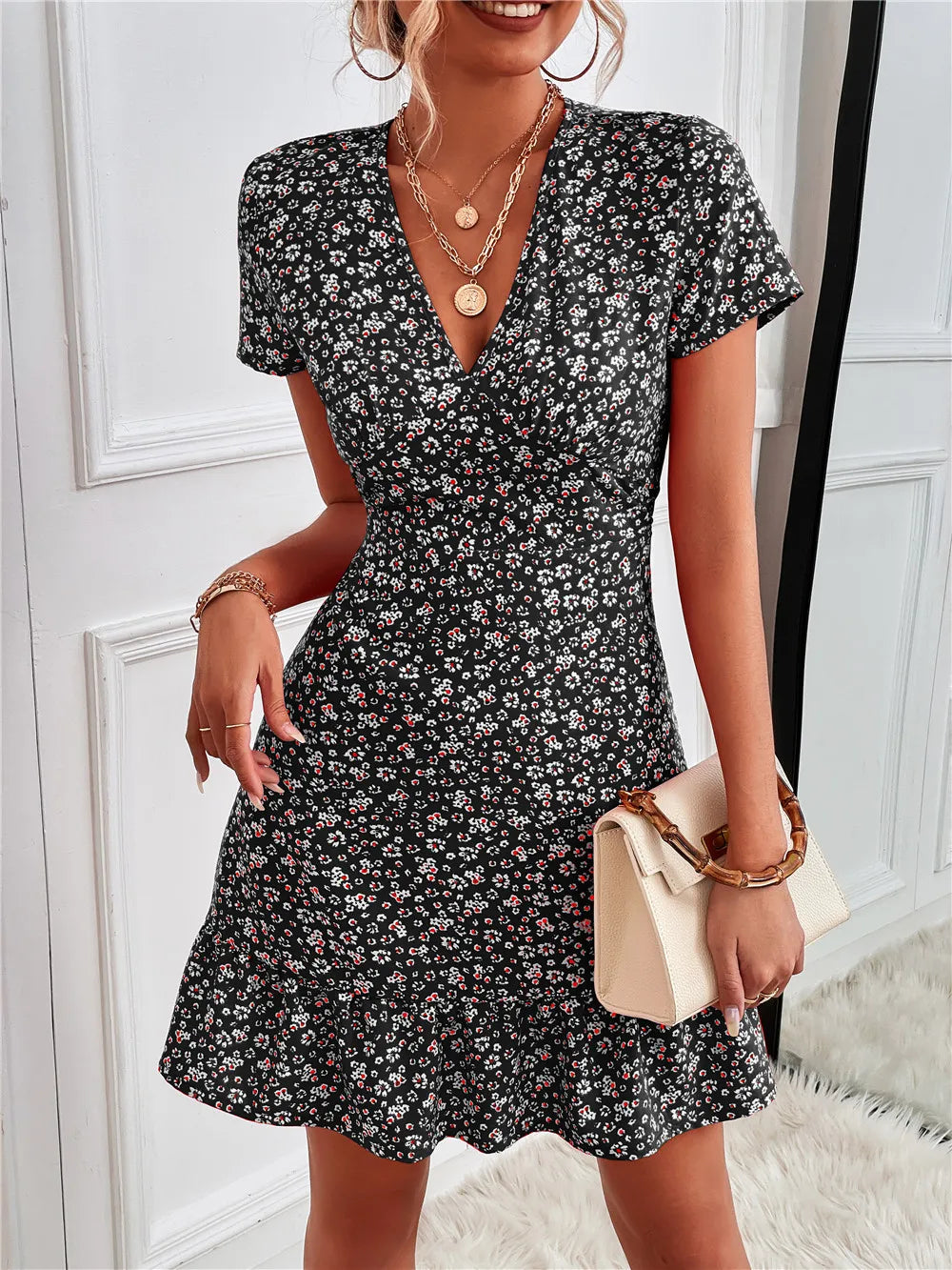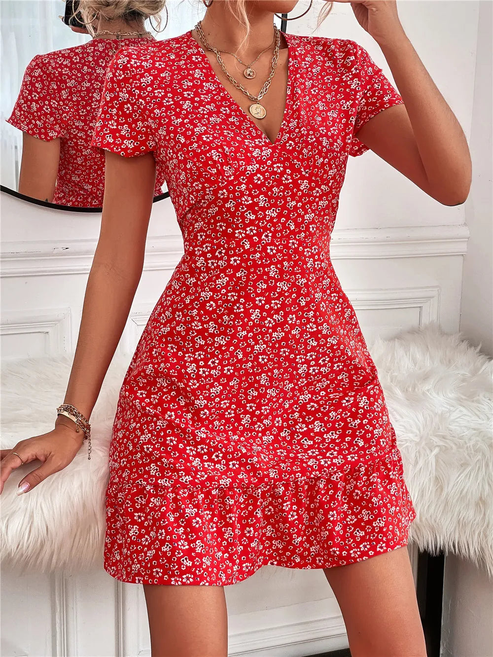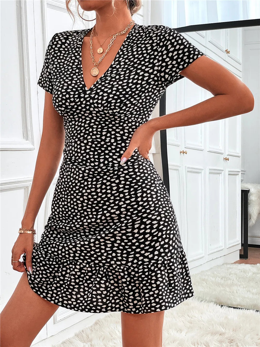 Printed Ruffled Hem V-Neck Short Sleeve Mini Dress