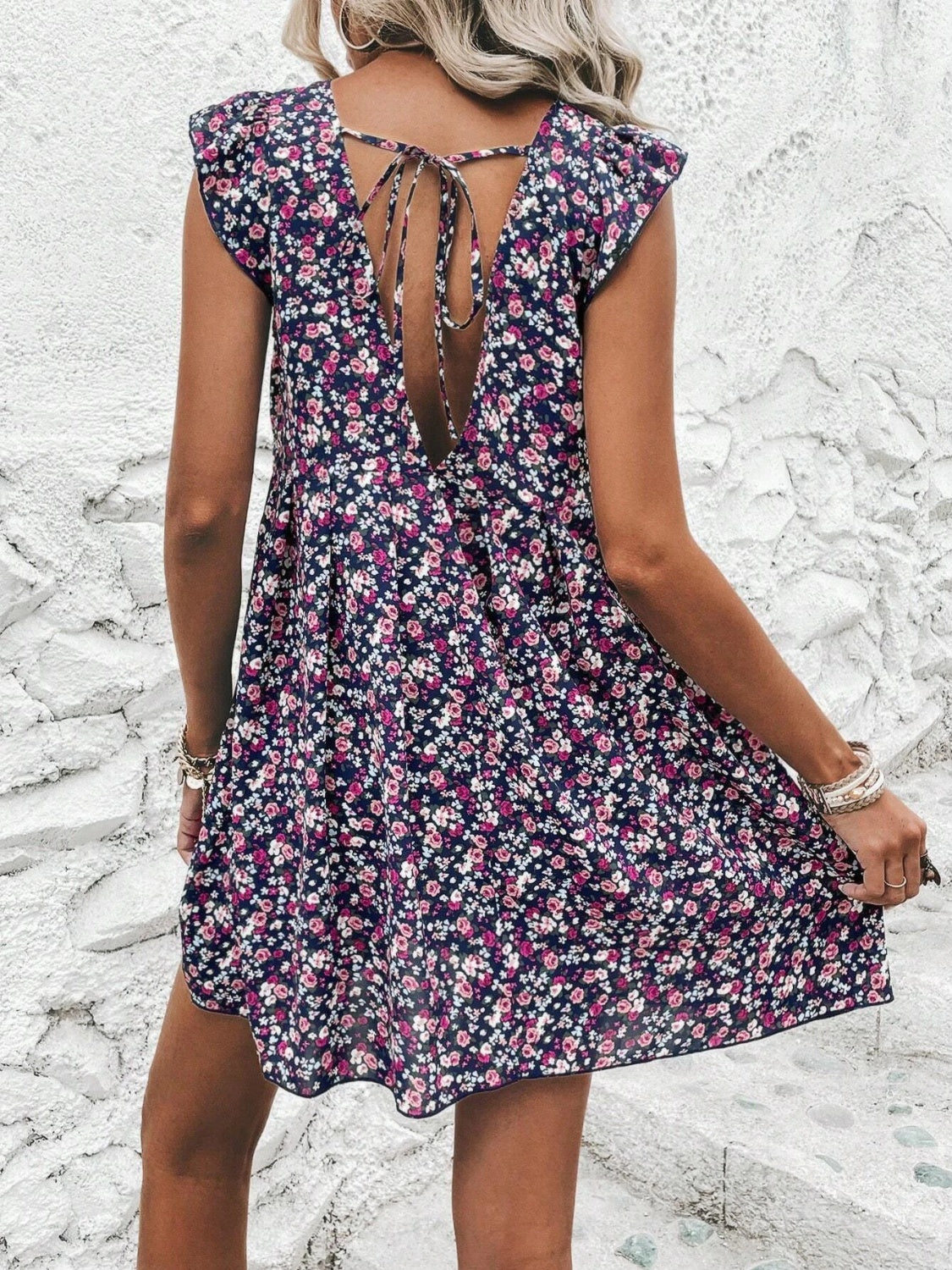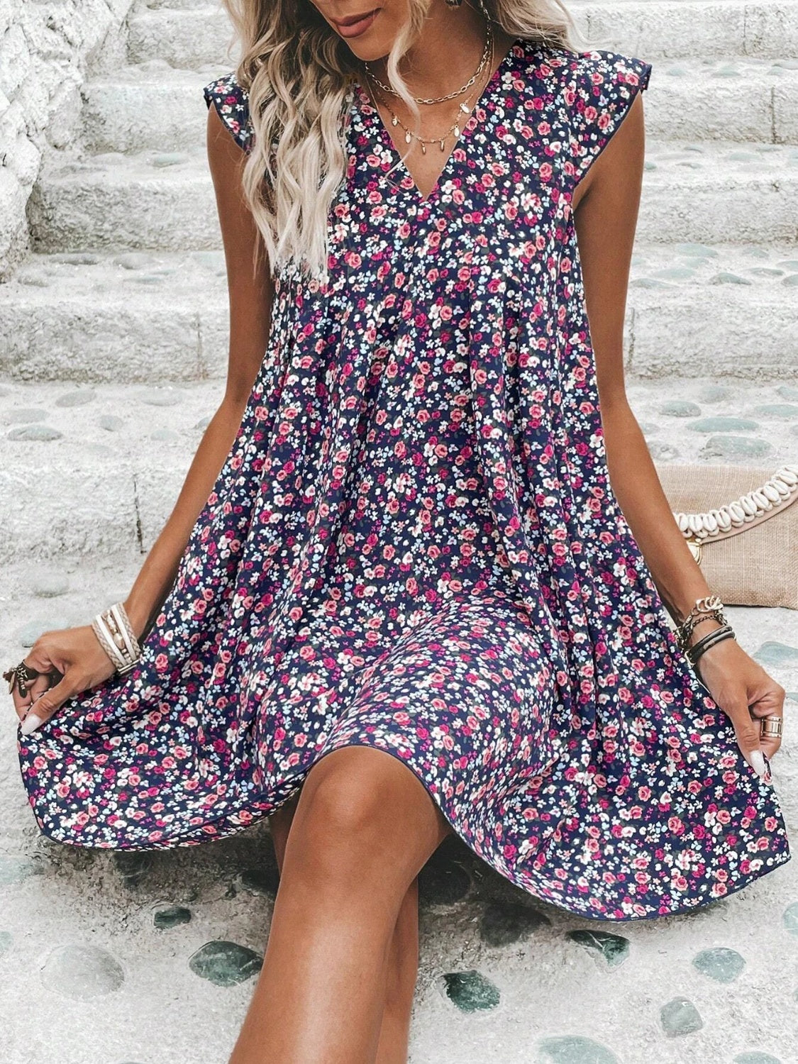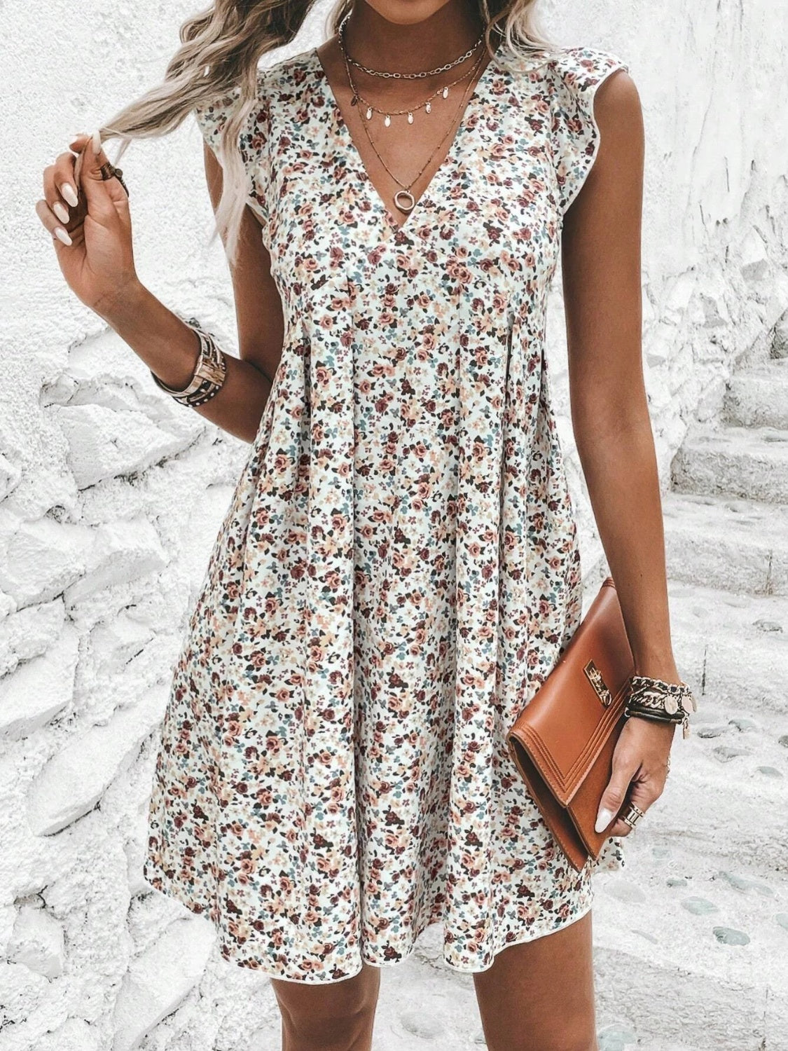Printed V-Neck Cap Sleeve Mini Dress