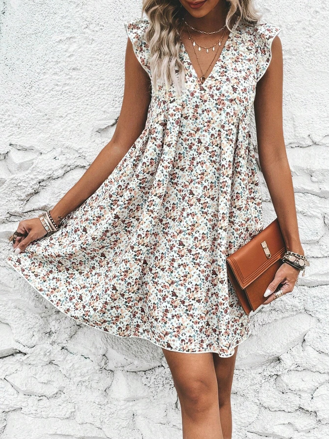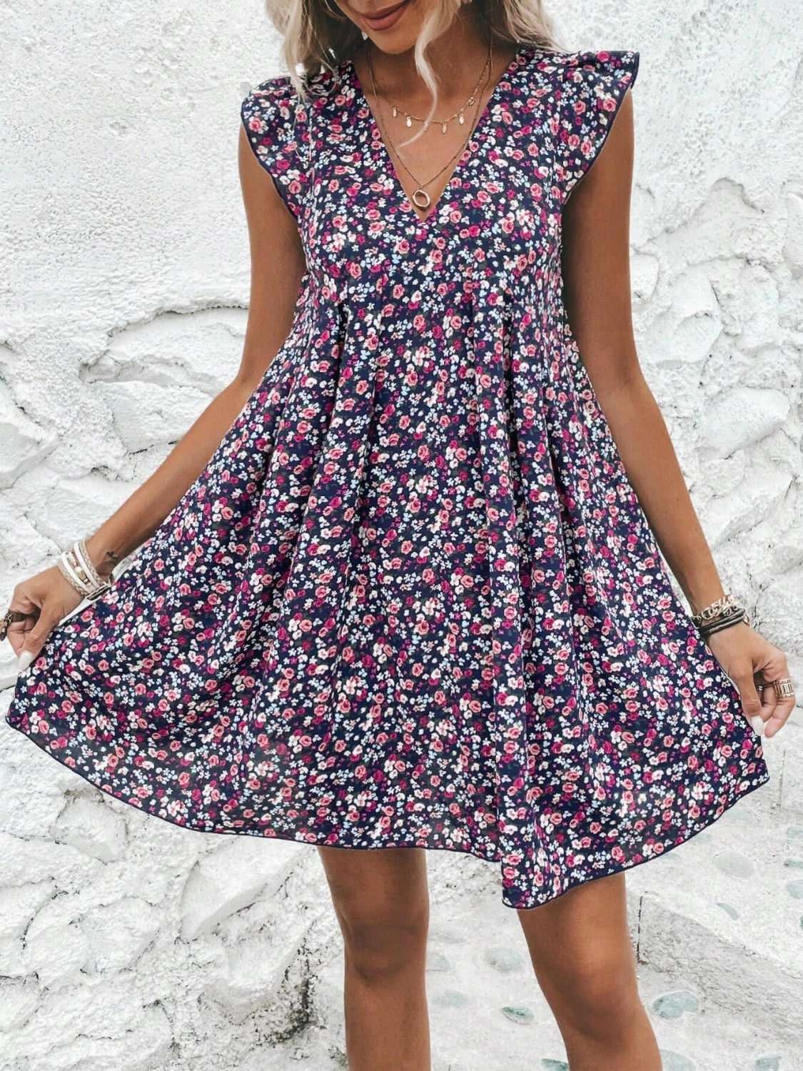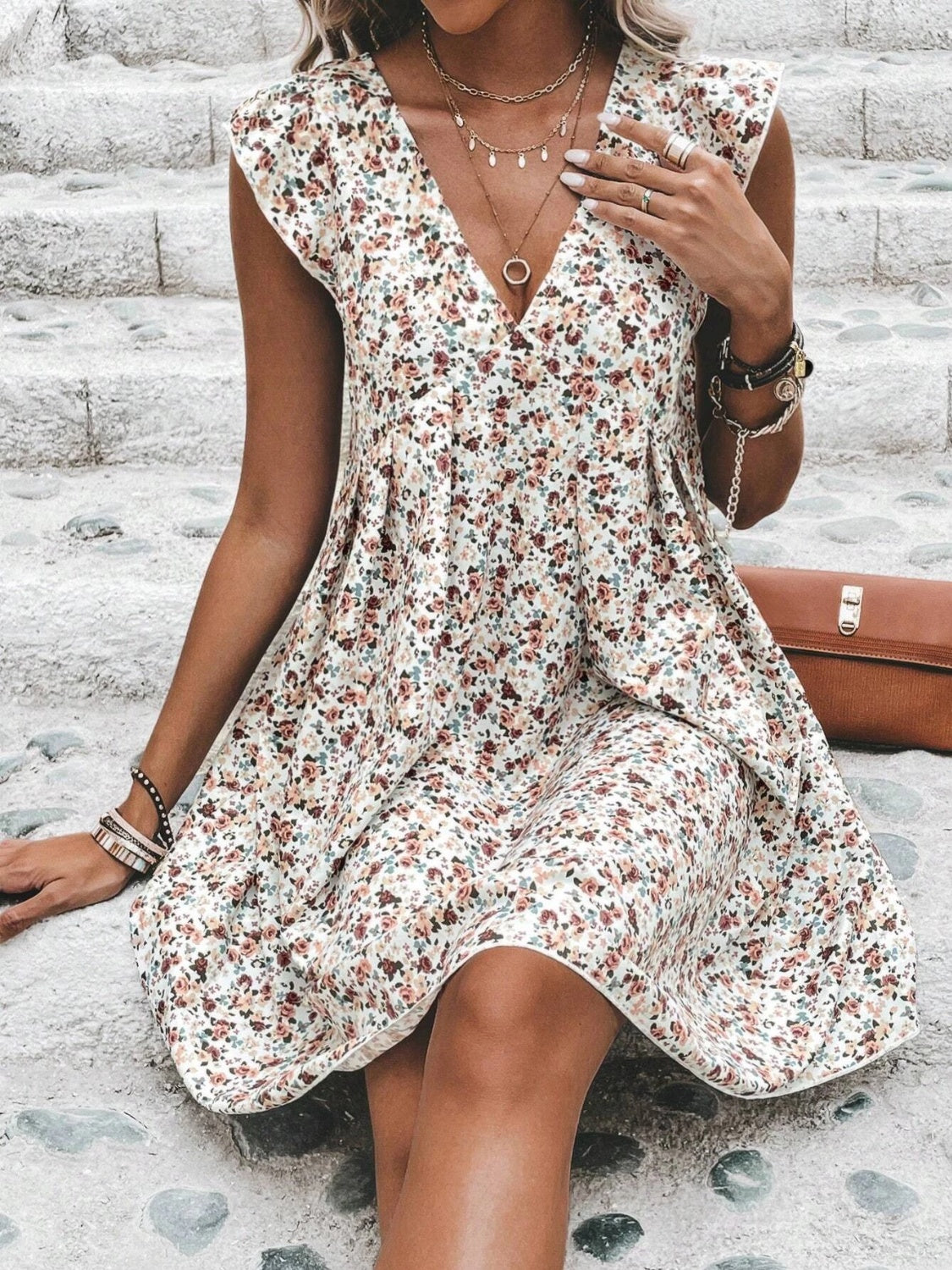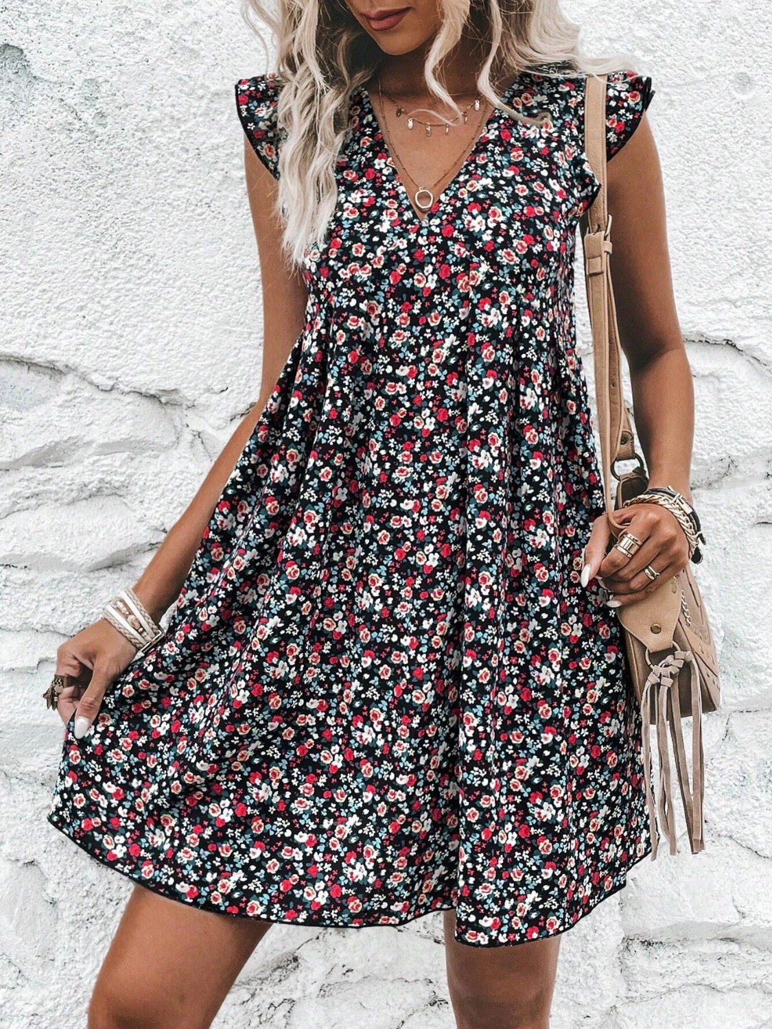 Printed V-Neck Cap Sleeve Mini Dress