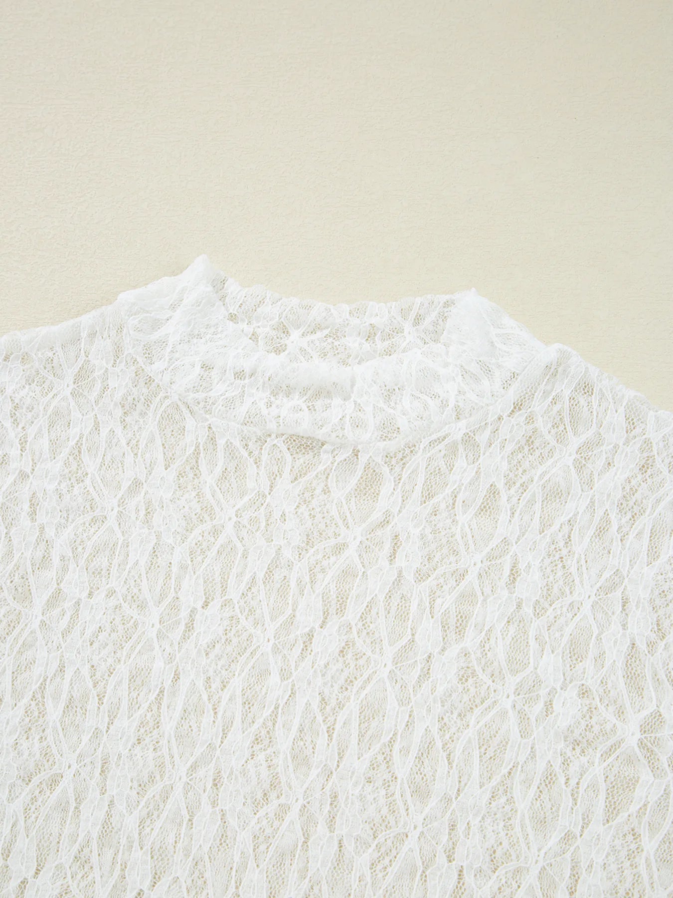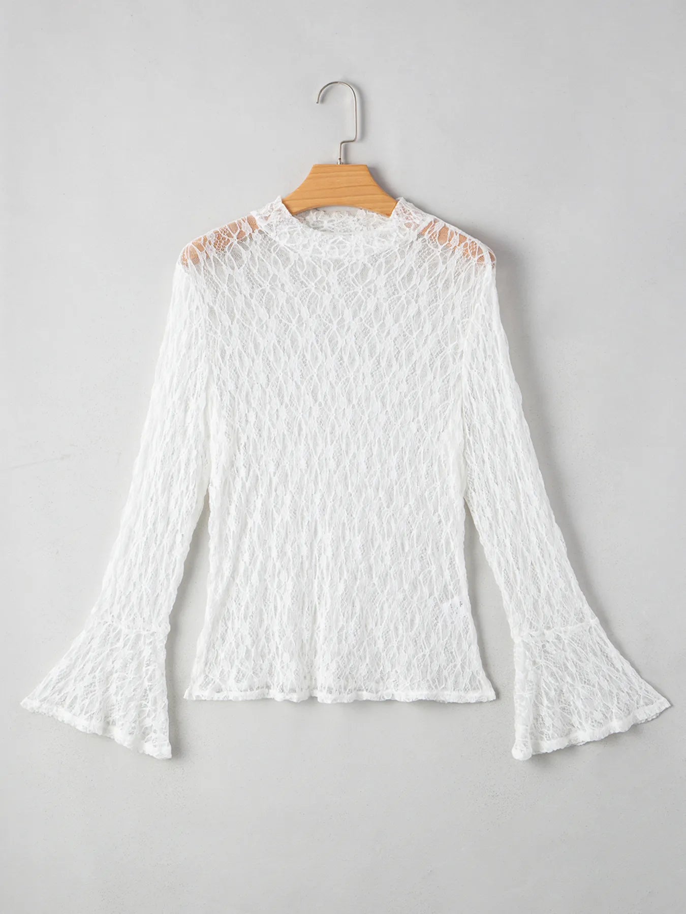 Sheer Lace Bell Sleeve Mock Neck Blouse