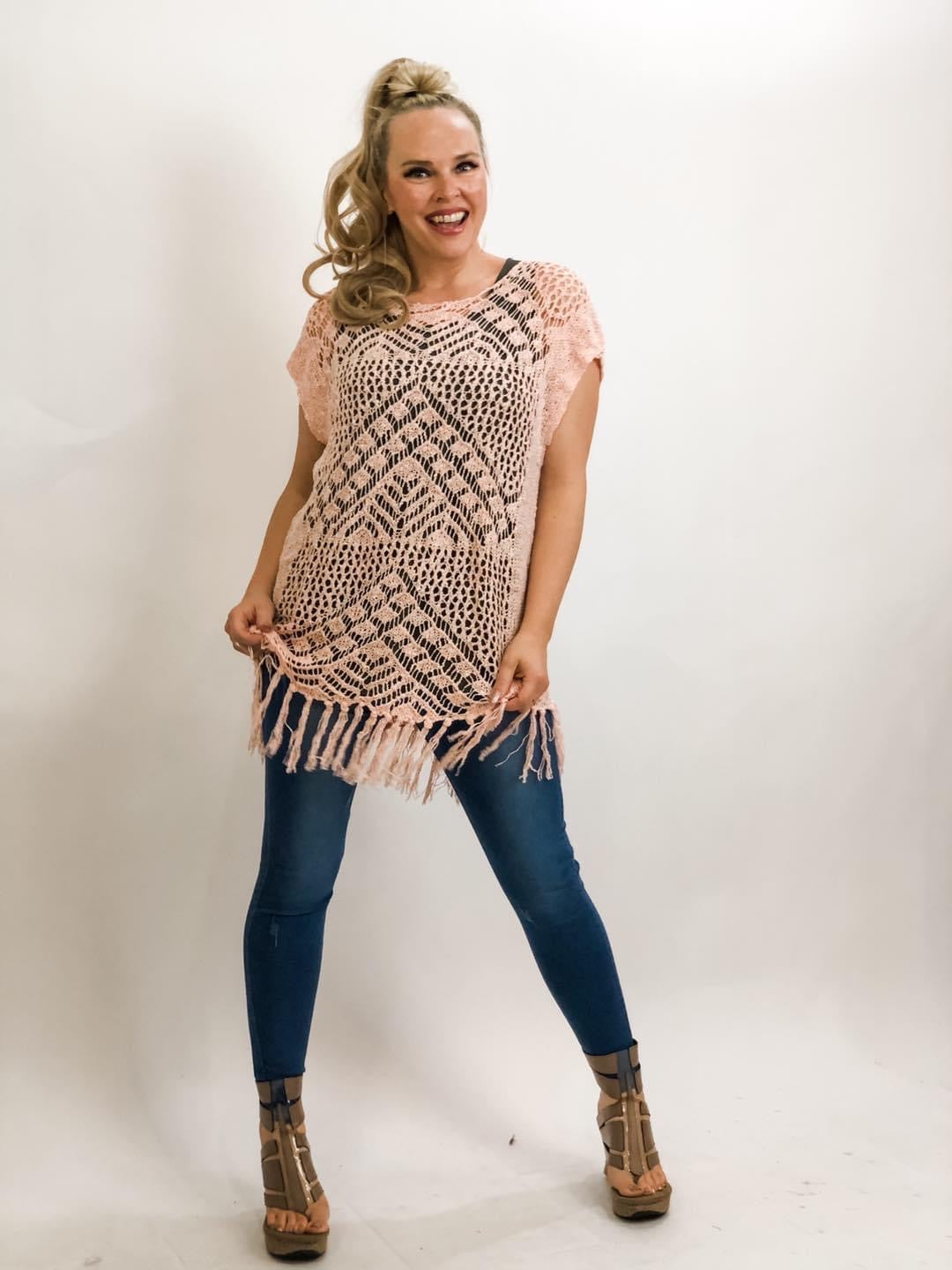 Short Sleeve Crochet Open Knit Top W/Fringe
