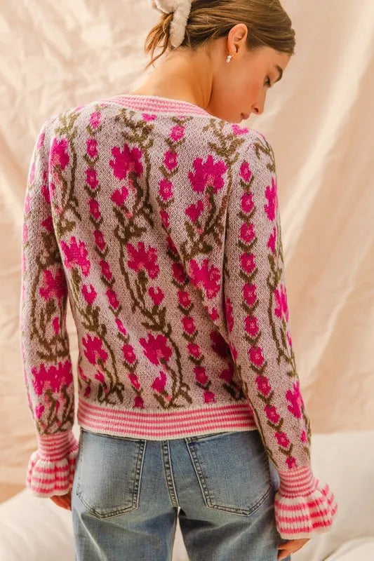 SO ME Floral Intarsia Button Up Sweater Cardigan