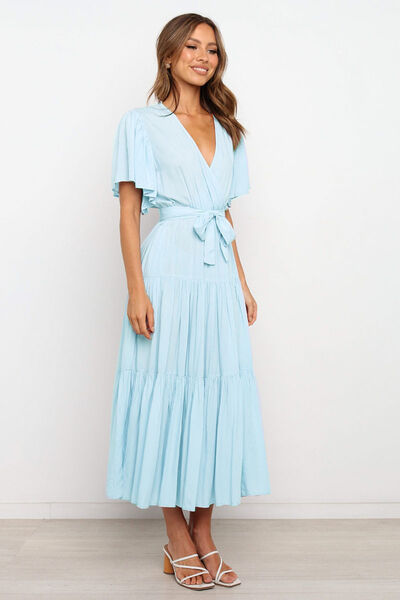 Tied Back Tiered Short Sleeve Midi Dress