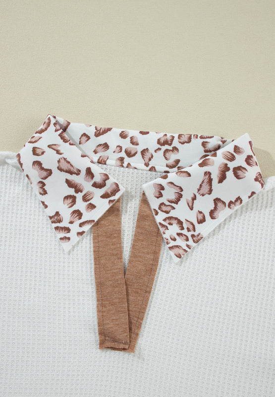 Waffle-Knit Leopard Johnny Collar Long Sleeve Top