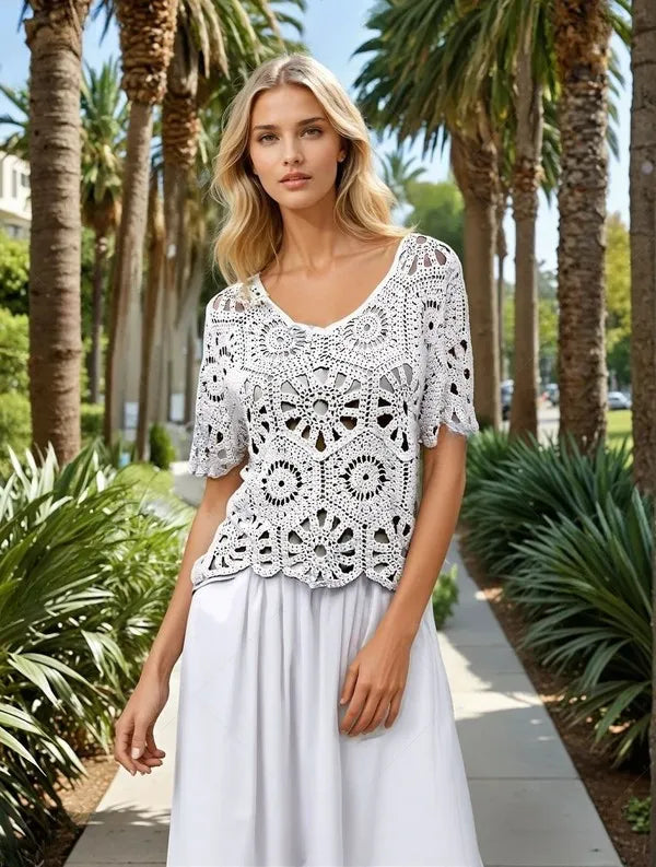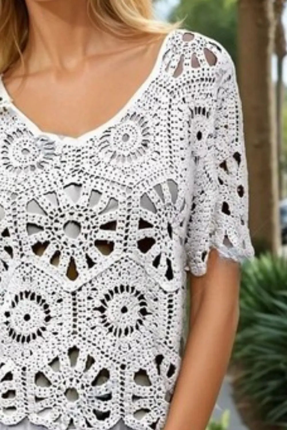 This crochet short sleeve top is perfect for the warmer weather. It features a beautifully detailed design that adds a touch of elegance to any outfit. The breathable material ensures comfort all day long.