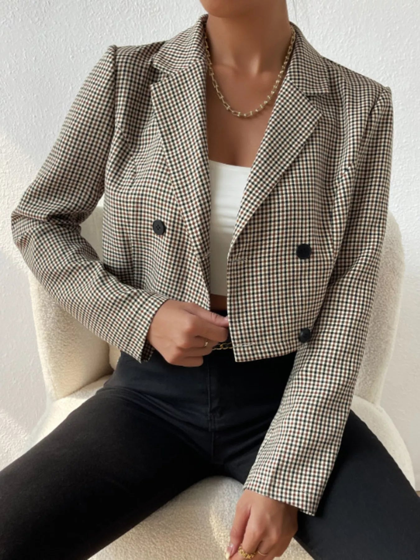 This sophisticated cropped blazer features a timeless black and white gingham plaid pattern that embodies classic elegance. Crafted from high-quality woven fabric, it showcases a structured lapel collar and double-breasted button closure for a professional yet fashion look. The cropped silhouette creates a modern feminine shape while the tailored construction ensures a flattering fit. Perfect for both business casual and smart casual occasions, this versatile piece can be dressed up or down. The monochrome plaid pattern adds visual interest while remaining effortlessly chic and easy to style with various wardrobe pieces.